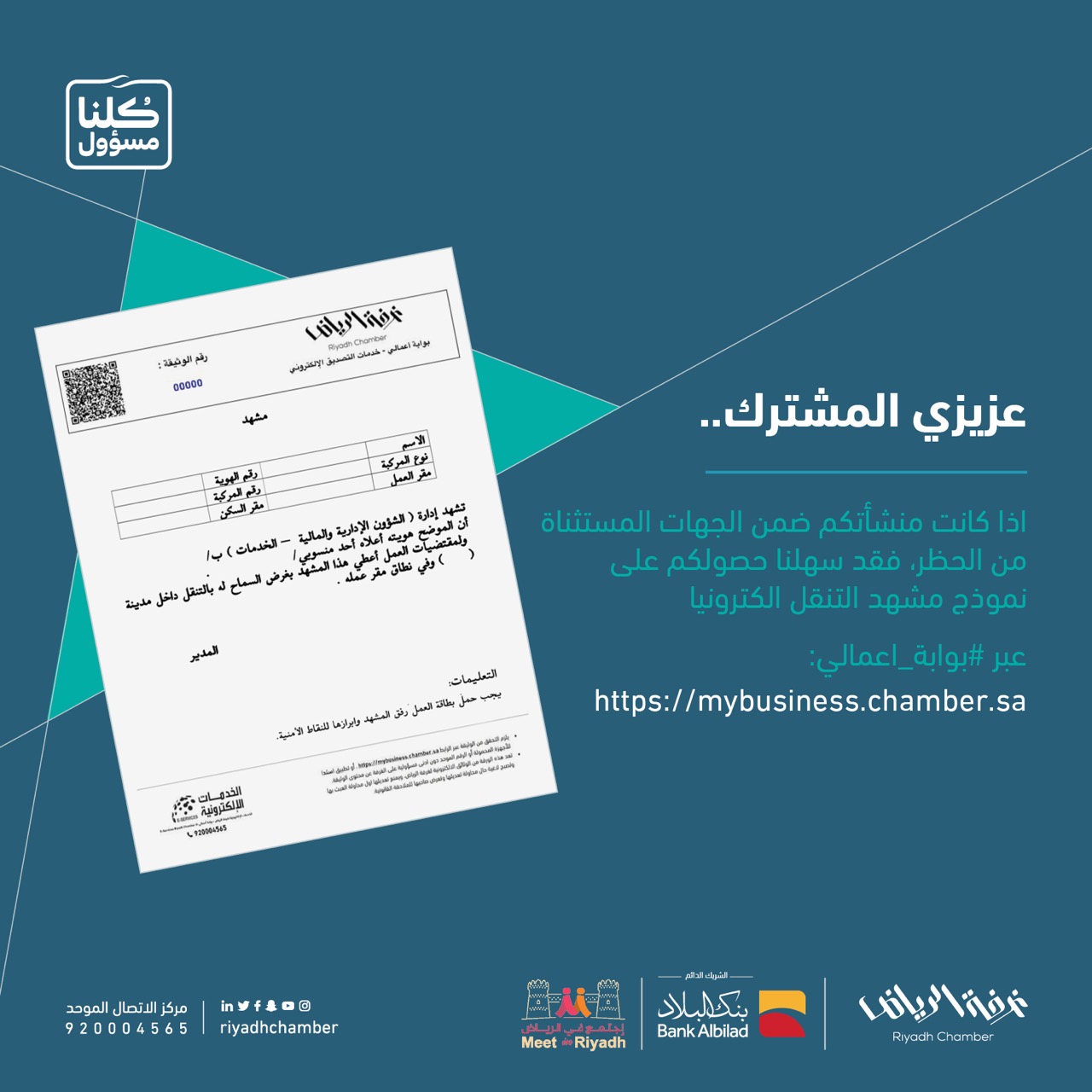 غـ ر فـ ة ا لـ ر يـ ا ض On Twitter سهلناها عليك من خلال بوابة اعمالي تستطيع الحصول على نموذج مشهد التنقل إلكترونيا اذا كانت منشأتك ضمن الجهات المستثناة من الحظر عبر