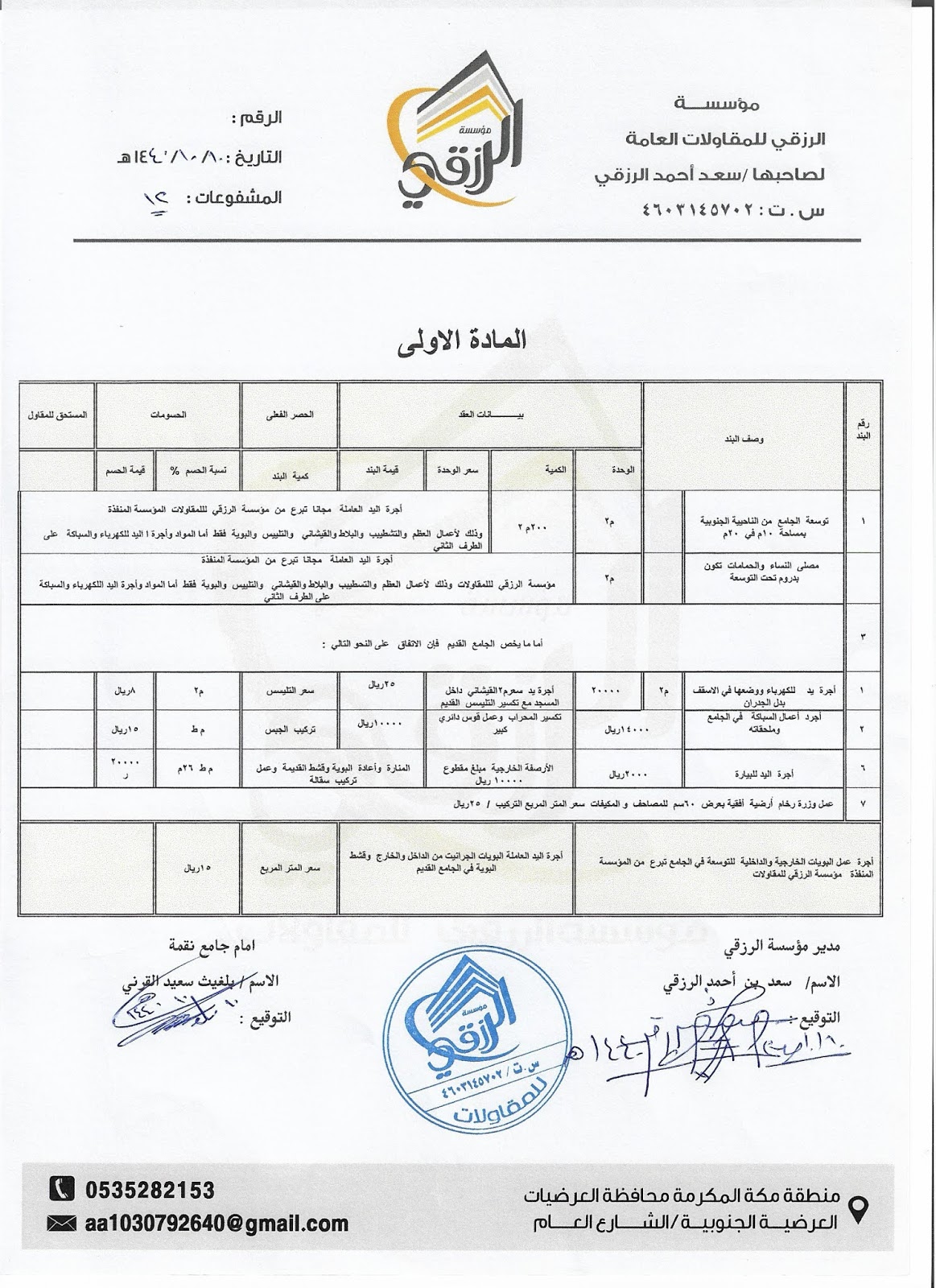 مدونة ابو عادل عقد توسعة وترميم جامع نقمة بمحافظة العرضيات تنفيذ مؤسسة الرزقي للمقاولات