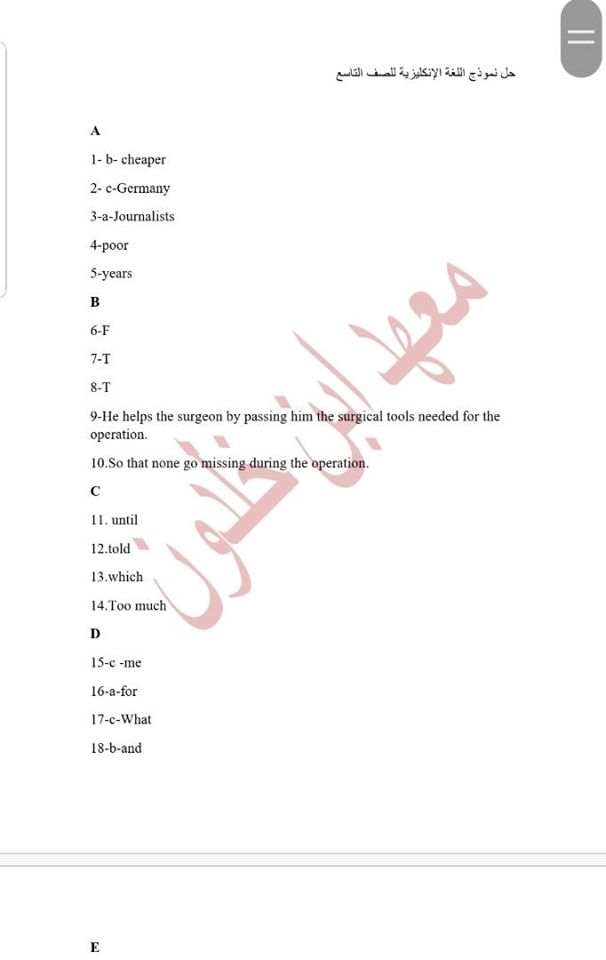 نموذج اختبار لغة انجليزية مع الحل للصف التاسع الفصل الثاني 2019 2020